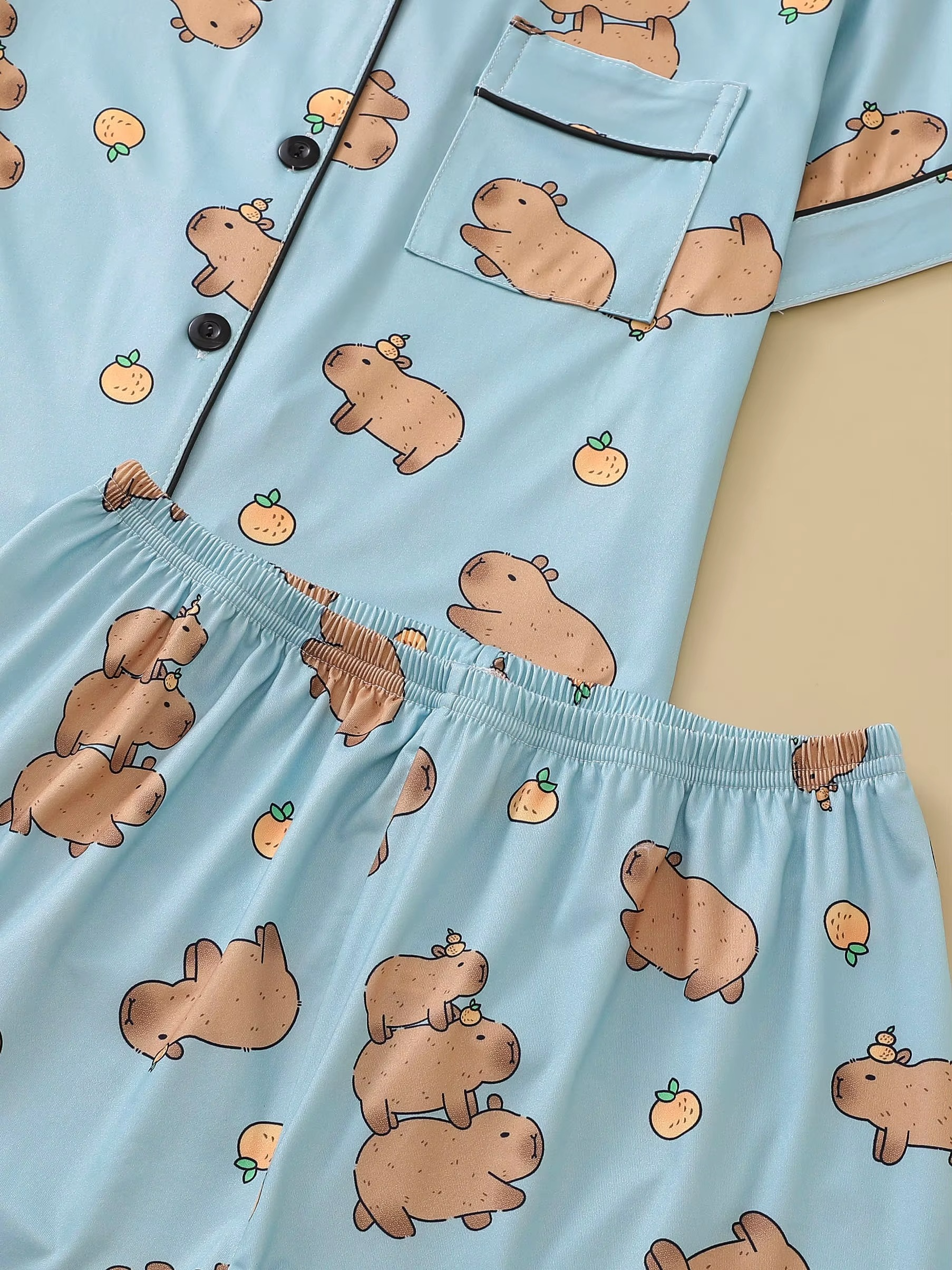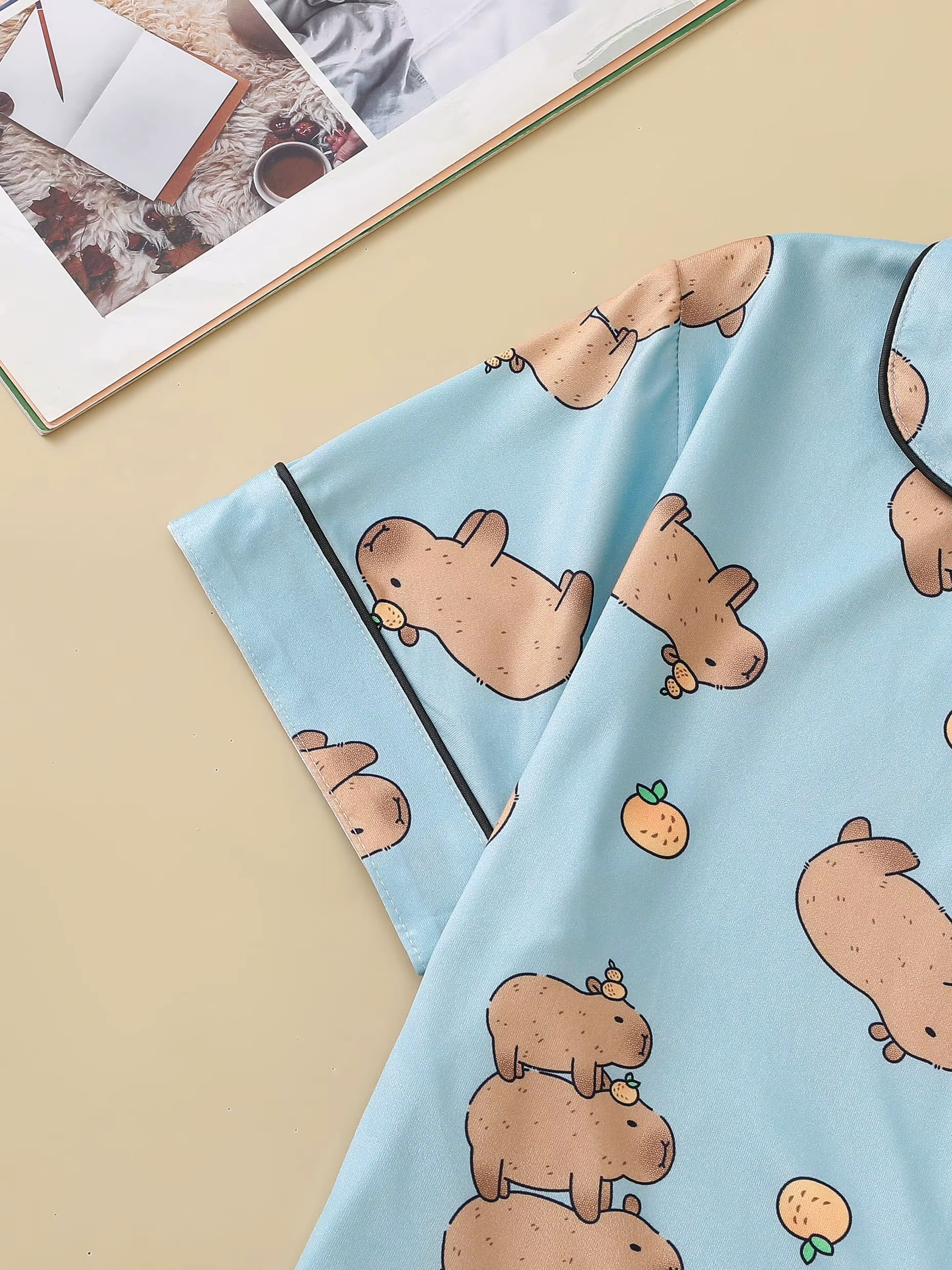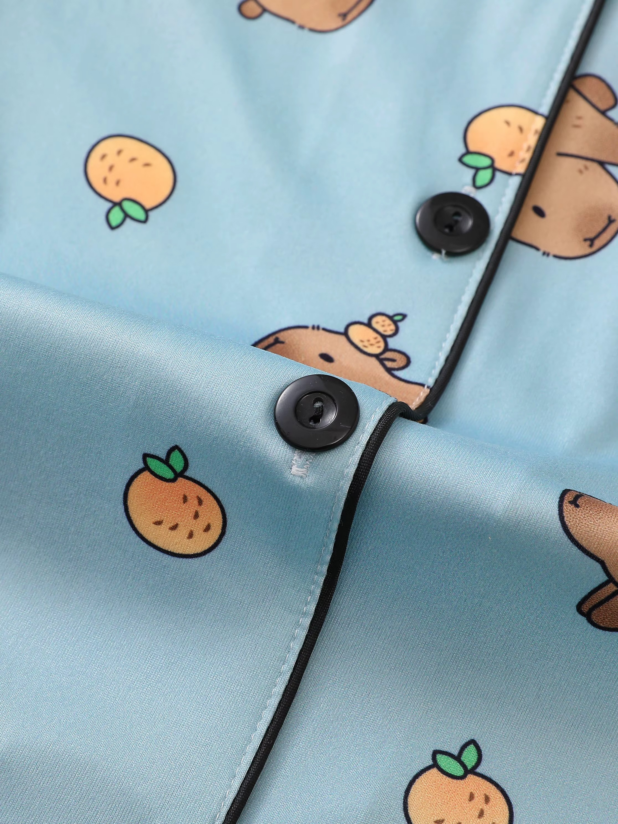 Com estampa exclusiva de capivarinhas fofas e pequenas laranjinhas em um fundo azul clarinho, ele traz aquele toque cute que transforma qualquer noite em um momento feliz e macio 💛✨