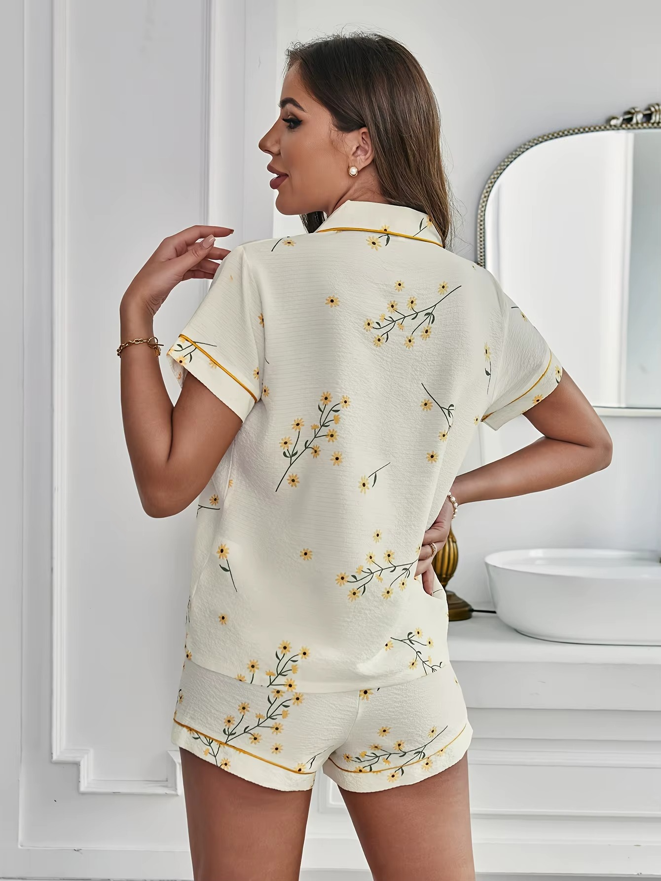 A estampa floral em tons de amarelo traz uma vibe alegre e suave, enquanto o acabamento em vivo dourado deixa o conjunto ainda mais elegante đź’›